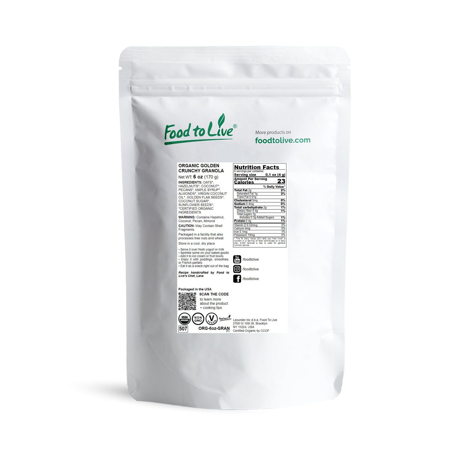 Organic Golden Crunchy Granola, 6 Ounces โ Non-GMO, Vegan, Kosher โ by Food to Live